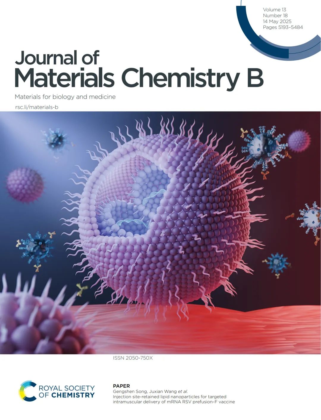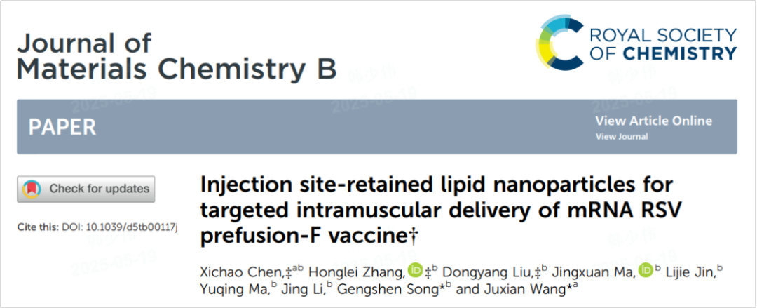 近日,悦康药业集团子公司北京悦康科创医药科技股份有限公司携手中国医学科学院&北京协和医学院医药生物技术研究所在材料科学领域的国际知名期刊《journal of materials chemistry b》在线发表题为“injection site-retained lipid nanoparticles for targeted intramuscular delivery of mrna rsv prefusion-f vaccine”的研究论文,该研究通过创新脂质纳米颗粒(lnp)设计,实现mrna疫苗在肌肉注射部位的精准滞留与长效释放,并显著降低在肝脏的蓄积,同时使rsv(呼吸道合胞病毒)疫苗诱导的特异性igg抗体以及中和抗体滴度大幅提升,为mrna技术的靶向递送开辟全新选择。同时,该论文还荣膺《journal of materials chemistry b》当期封面文章,彰显重要学术价值与行业影响力!